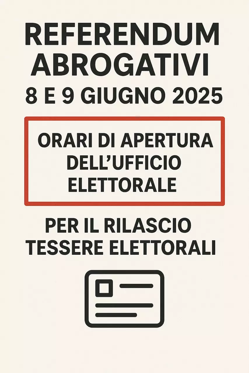 Referendum abrogativi 8 e 9 giugno 2025 Orari di apertura dell’Ufficio Elettorale per il rilascio tessere elettorali
